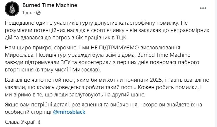 Позже гитарист извинился на камеру, а скандальные посты удалил. Он даже пообещал собрать средства для ВСУ. Однако в Burned Time Machine разорвали сотрудничество с Мирославом, а его сбор на данный момент — всего 200 гривен.