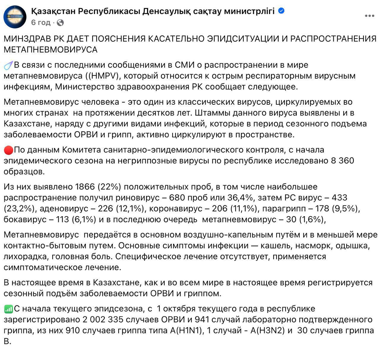 Об этом сообщило Министерство здравоохранения Казахстана.