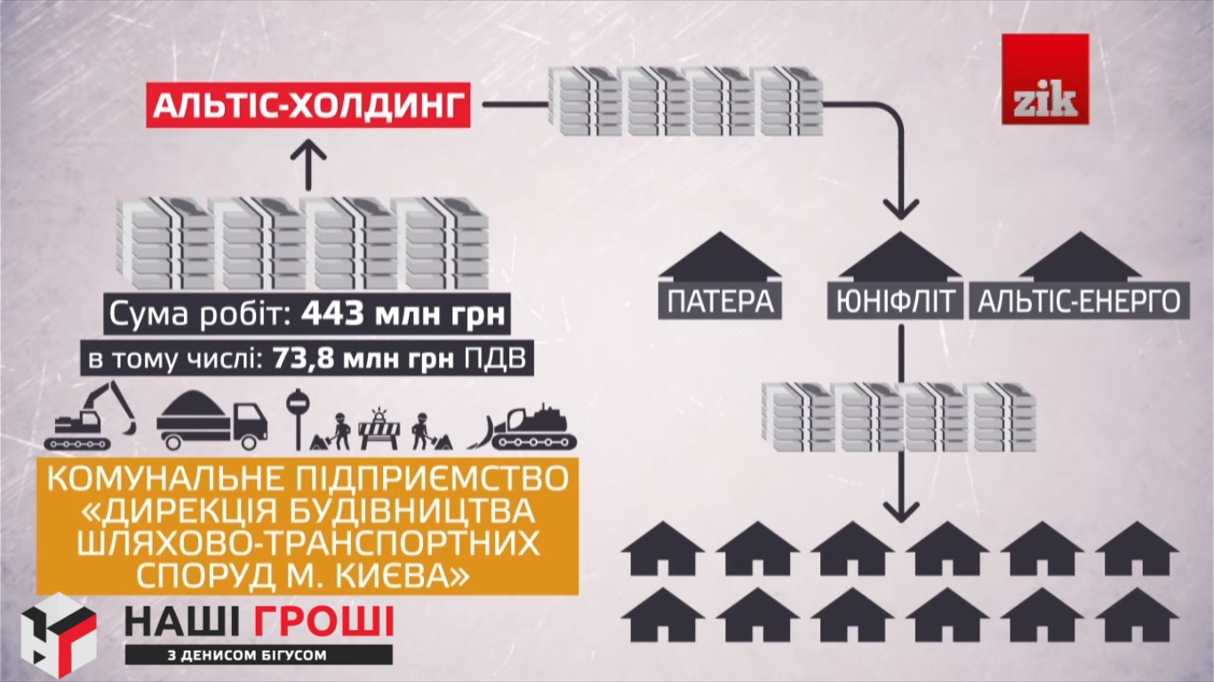 Угода, за якою податківці планували донарахувати кошти: виконання «Альтіс-Холдингом» замовлення для комунального підприємства «Дирекції будівництва шляхово-транспортних споруд м. Києва» у 2014-2015 рр. Сума угоди становила – 443 млн грн., в тому числі 73,8 млн ПДВ. За схемою угоди, наданою джерелом у податковій, отримані "Альтіс-Холдингом" кошти були перераховані на низку компаній, визначених як "сумнівні". Від комунального підприємства гроші потрапили до «Альтіс-Холдингу», а потім перераховувалися на три фірми, з яких кошти направлялися на компанії другого рівня, серед яких є реальні виконавці робіт. Тобто корпорація перераховувала кошти сама собі через низку фірм. Юрист Володимир Місечко пояснює, що така схема використовується для двох речей – для завищення своїх витрат і для переведення безготівкових коштів у готівку.