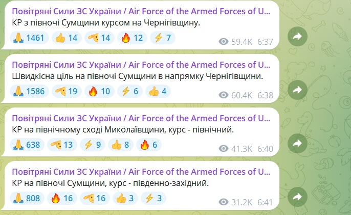 Воздушные силы информируют о ракетах в Сумской и Николаевской областях, а также в направлении Кривого Рога и Черниговской области.