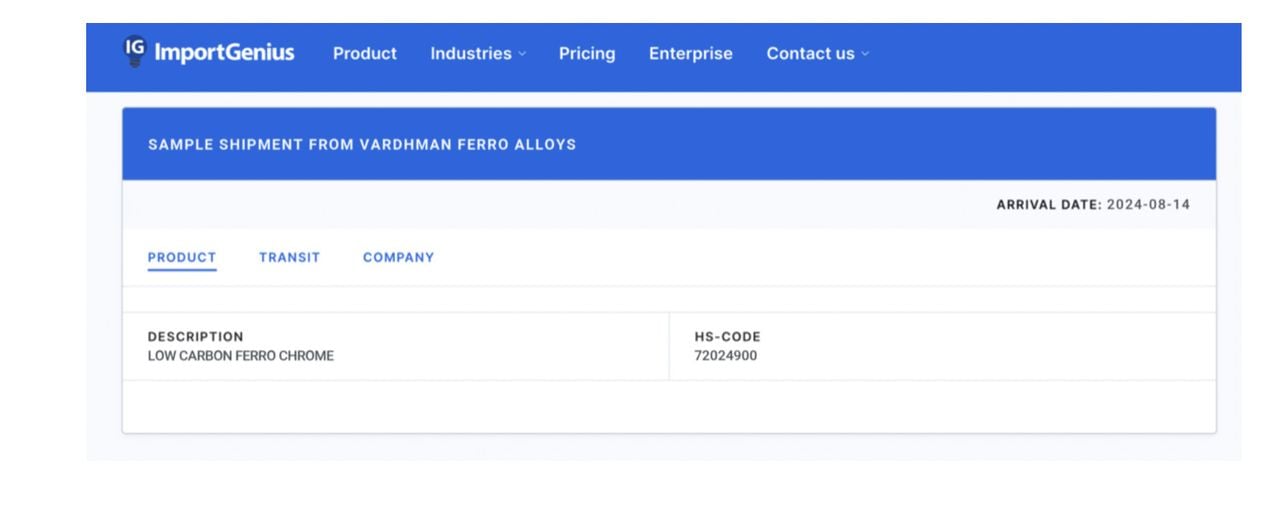 Индийская компания Vardhman Ferro Alloys, согласно информации на собственном сайте, якобы продает металлы более чем в 90 стран мира. Но данные ImportGenius свидетельствуют, что на самом деле за последние 10 лет компания имела прямые контракты только с 22 странами. Это значит, что значительная часть их деятельности может проходить через косвенные маршруты и посредников. Схема выглядит так: российский завод MidUral продает феррохром Phoenix Resources AG в Швейцарии, затем покупает его Vardhman Ferro Alloys в Индии, а оттуда товар переправляется в эстонскую MBR Metals OU. Последняя уже поставляет этот металл европейским потребителям, формально как "индийский" продукт.