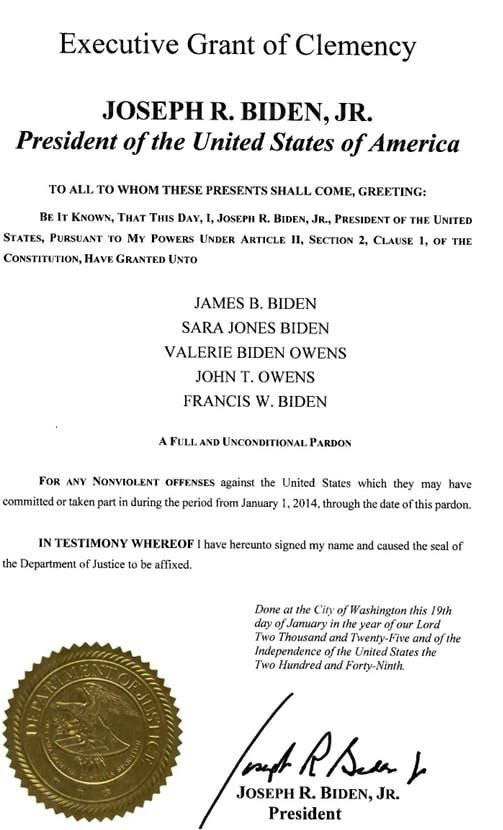 Он подчеркнул, что эти атаки не прекращаются, и поэтому принял решение использовать свои полномочия для помилования своих близких, в том числе Джеймса Байдена, Сару Джонс Байден, Валери Байден Оуэнс, Джона Оуэнса и Фрэнсиса Байдена.