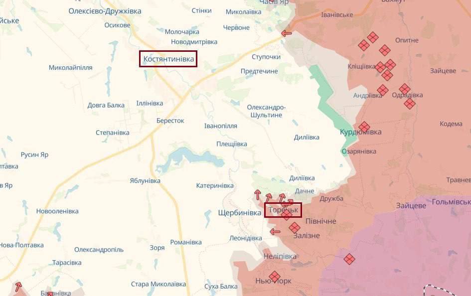 В частности, по мнению аналитиков, передислокация войск оккупантов для усиления российского группирования на Торецком направлении может указывать на попытки возобновить атаки в направлении Константиновки.