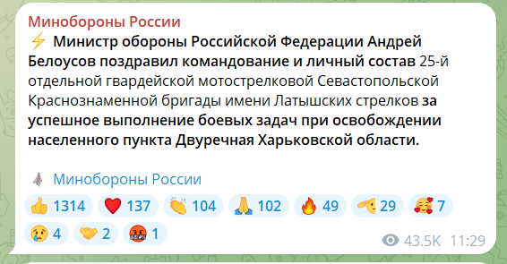 А 28 января захватчики из МО РФ заявили о якобы полной оккупации этого поселка, которое в государстве-агрессоре именуют "освобождением". В сообщениях (а якобы оккупации Двуречной в этот день в Telegram-канале российского минобороны оно было посвящено не одно) захватчики не смогли удержаться от пафоса относительно "решительных действий подразделений группировки войск "Запад" и в частности оккупационной бригады, которая воюет в районе этого поселка.