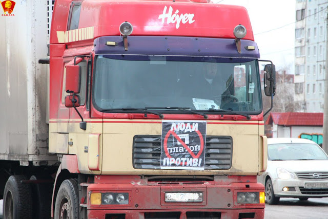 В Уфе, Калуге и Пензе гражданские активисты поддержали дальнобойщиков пикетами и митингами. В Туле офис «Платона» обмазали машинным маслом.