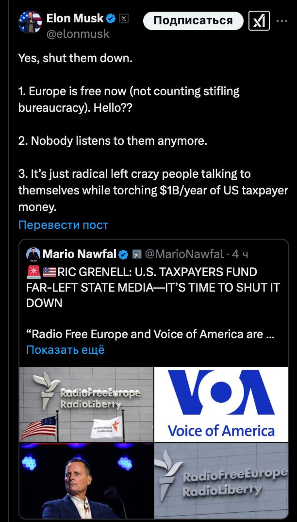 Илон Маск призвал к закрытию «Радио Свобода» и «Голоса Америки», утверждая, что эти государственные СМИ больше не имеют аудитории и тратят миллиарды долларов из налогов без пользы.
