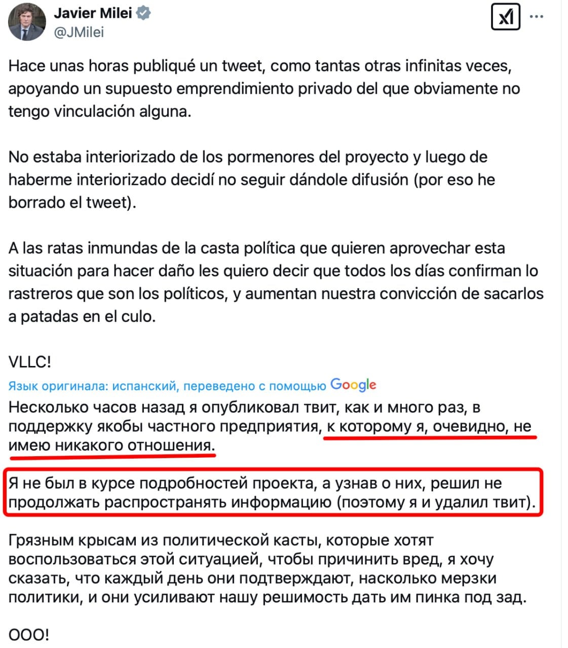 После того, как токен вырос до капитализации в $4.59 млрд, Милей удалил твит, заявив, что не имеет отношения к этому событию и не видит смысла продолжать проект.