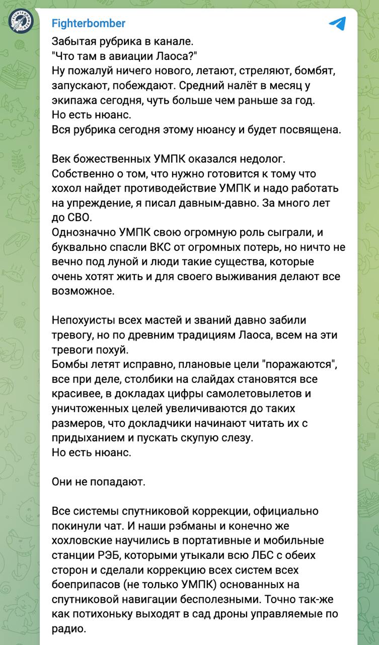 По его информации, УМПК (унифицированный модуль планирования и коррекции) больше не попадают в цель, так как ВСУ научились сбивать их спутниковую коррекцию с помощью РЭБ, которыми оснащена вся линия фронта.