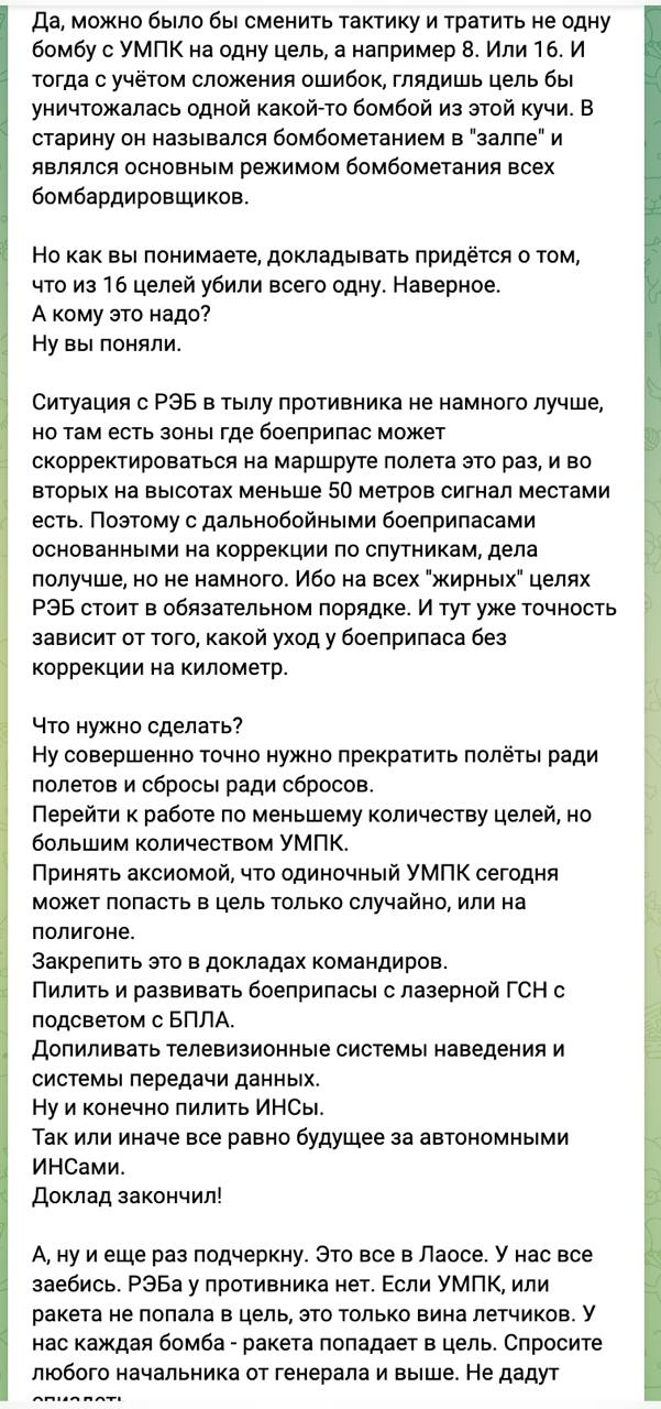 Поэтому сейчас они могут эффективно поражать только крупные цели в тылу, такие как заводы, фабрики, города. "Телеграм"-канал пишет, что теперь попасть в менее крупную цель можно, лишь выпуская на нее несколько бомб.