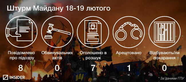 Как и раньше, ГПУ сообщила о подозрении Януковичу, Захарченко, Ратушняку, командиру спецроты «Беркут» («черная рота с желтыми повязками»), Д. Ссадовнику и 22-м его подчиненным, а также командиру киевского полка «Беркут» и его заместителю, причастным к этому расстрелу акций протестов; 5 из них арестованы, другие — объявлен в розыск. Как известно, Дмитрий Садовник был освобожден судьей Волковой под домашний арест, после чего тот сбежал из страны. Волкова была отстранена от исполнения обязанностей судьи, однако она обжаловала это решение в Высшем административном суде и добилась отмены своего отстранения.