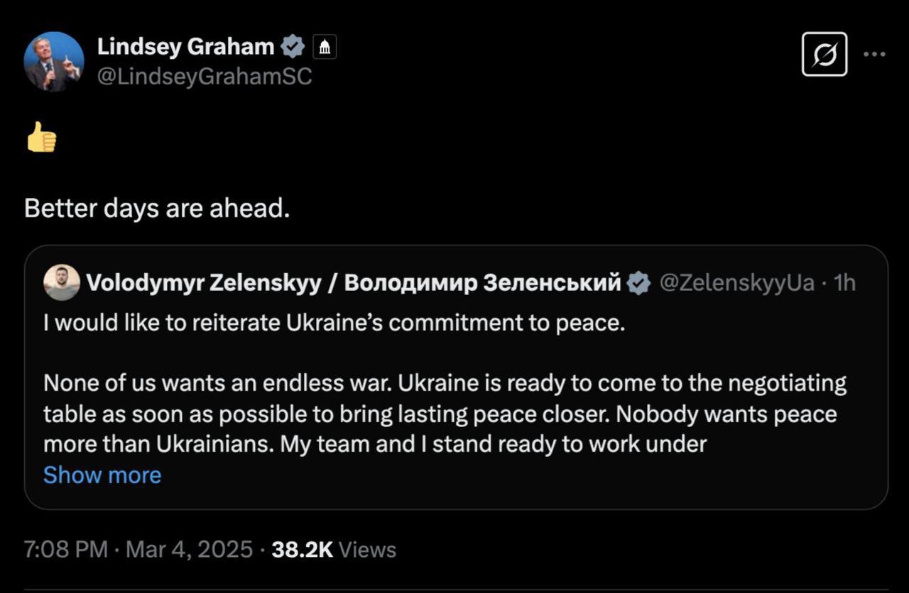 Сенатор-республиканец Линдси Грэм сделал репост публикации президента Украины, сказав, что "лучшие дни впереди".