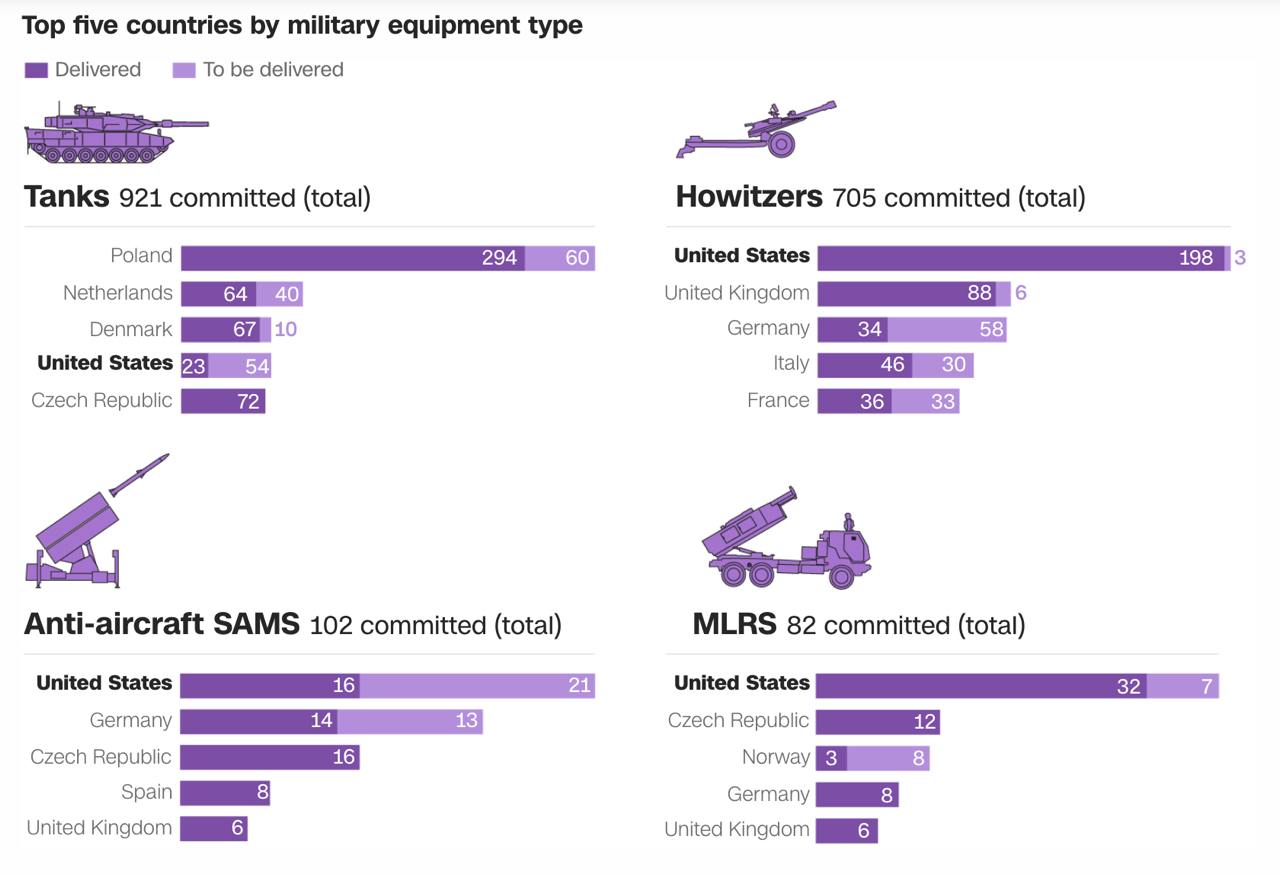 США лидируют по поставкам в Украину всех видов вооружений, кроме танков. Они занимают первое место по поставкам гаубиц, установок РСЗО и современных систем ПВО.