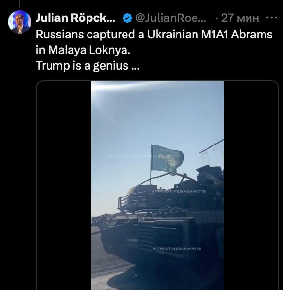 Кроме того, в Малой Локне оккупанты захватили американский танк M1 Abrams, который был на вооружении украинских сил.