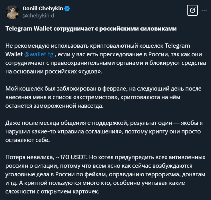 Российский активист Данила Чебыкин обвинил приложение Telegram «Кошелек» в сотрудничестве с властями РФ.