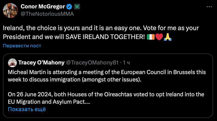 «Ирландия, выбор в твоих руках, и он очевиден. Проголосуй за меня в качестве своего президента, и мы ВМЕСТЕ СПАСЕМ ИРЛАНДИЮ!», — отметил боец.