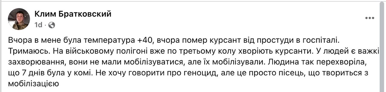 "Вчера у меня была температура +40, вчера умер курсант от простуды в госпитале. На военном полигоне уже по третьему кругу болеют курсанты. У людей есть тяжелые заболевания, они не должны были мобилизоваться, но их мобилизовали. Человек так переболел, что 7 дней был в коме. Не хочу говорить о геноциде, но это просто писец, что творится с мобилизацией", – рассказал Братковский.