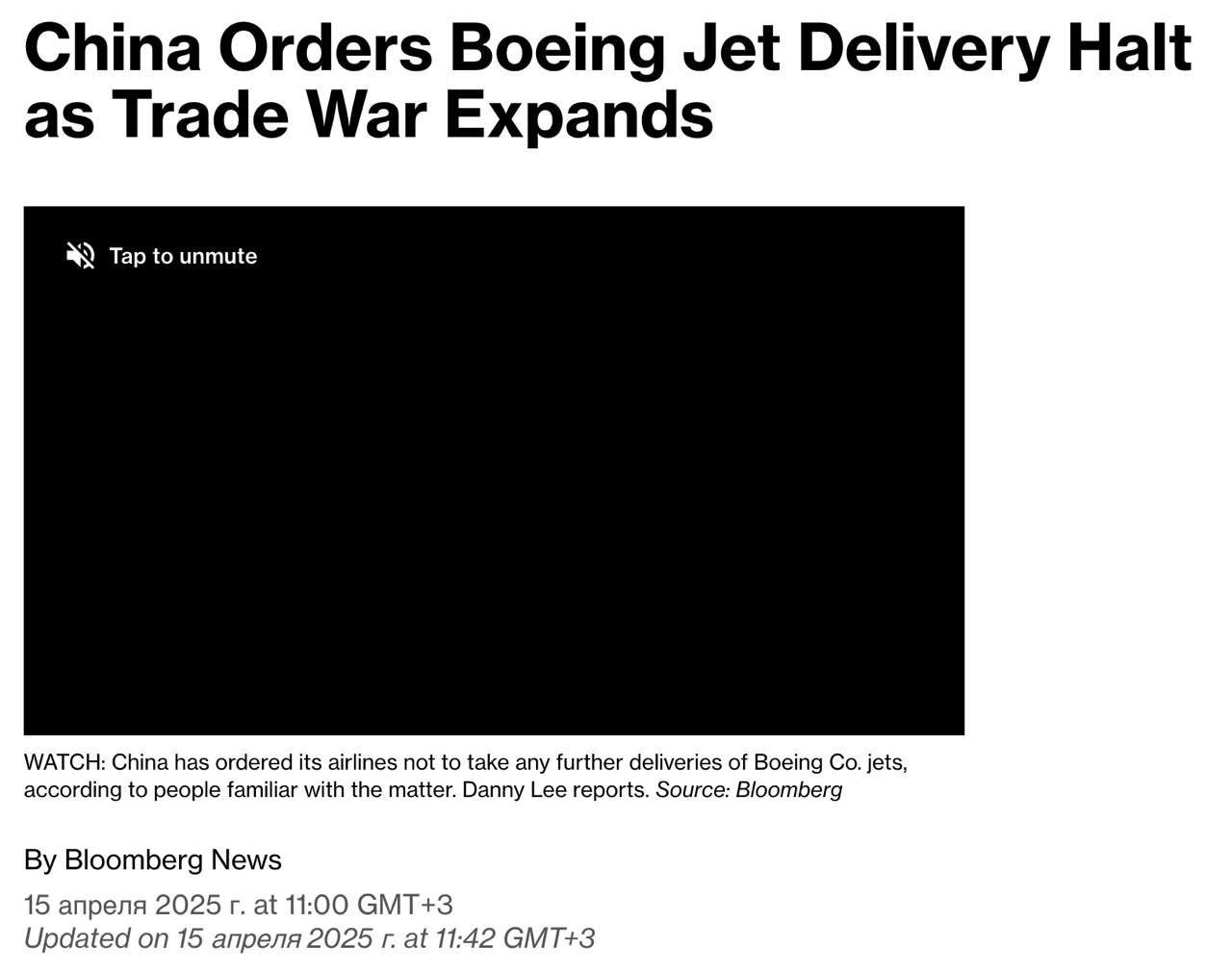 Это распоряжение последовало после того, как на прошлых выходных Китай ввел пошлины на американские товары в размере 125%. Эти сборы более чем вдвое увеличили бы расходы на приобретение самолетов и запчастей, произведенных в США, что сделало бы приемку самолетов Boeing китайскими авиакомпаниями нецелесообразной.