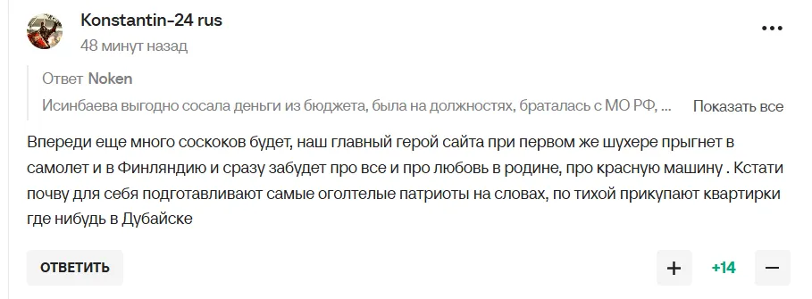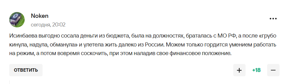 Это несоответствие вызвало волну возмущения среди комментаторов в соцсетях. Пользователи пишут, что Исинбаева "получила все от режима", работая на государственных должностях и сотрудничая с Министерством обороны, а затем "грубо кинула, надула, обманула", воспользовавшись статусом, связями и бюджетными потоками — и спокойно уехала в Испанию, оставив долги.