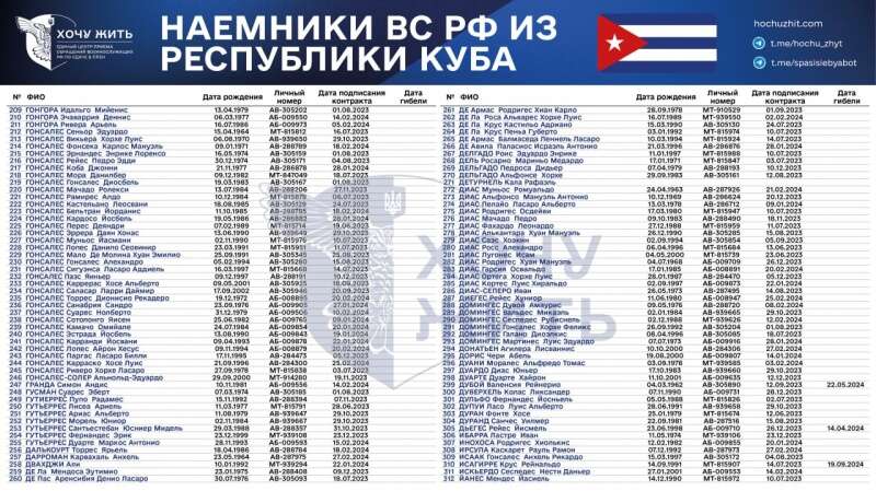 "Нам достоверно известны имена и личные данные 1028 кубинцев, которые подписали контракт с Вооружёнными силами РФ в 2023-2024 годах", - отмечается в сообщении.