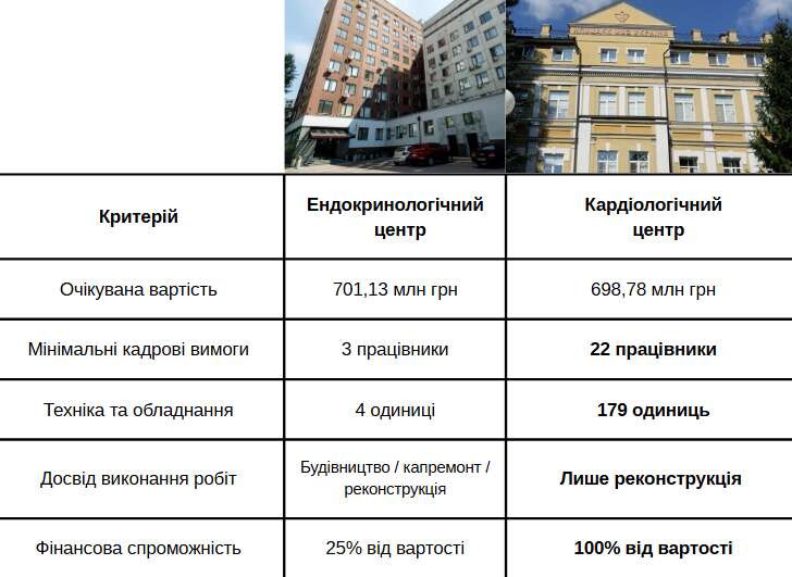 Финансовая состоятельность: в кардиоцентре установлен максимальный порог — не менее ожидаемой стоимости закупки, это 698 млн грн. В эндокринном центре порог — 25% от стоимости закупки.