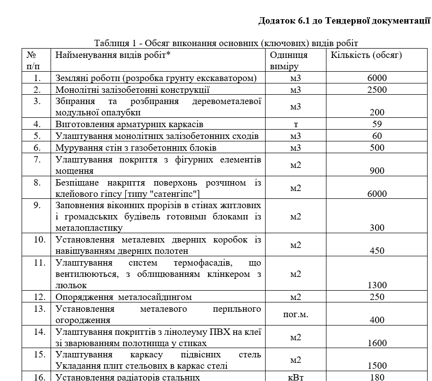 Это отдельная таблица из 37 видов ключевых работ с четкими метриками. Например: прокладка 7 000 метров кабеля, установка 30 видеокамер, монтаж двух лифтов, и т. д. Все объемы должны быть подтверждены документально — одним договором или несколькими, но в целом не менее указанных цифр.