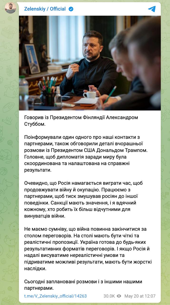 «Очевидно, что Россия стремится выиграть время для продолжения войны и оккупации. Мы сотрудничаем с партнерами, чтобы давление способствовало изменению поведения россиян. Санкции играют важную роль. Если Россия продолжит настаивать на нереалистичных условиях и подрывать возможные достижения, должны последовать суровые последствия», — заявил Зеленский.