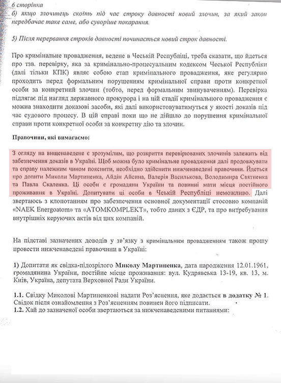 "На підставі встановлених даних дійсним власником майнових вартостей компанії Bradcrest Investment та бенефіціаром зазначених рахунків компанії був Микола Мартиненко. Існує обгрунтована передумова, що вказані комісійні були в дійсності хабарем для зазначеної особи, за те, що вплинув на закріплення за товариством "Шкода" замовлень в Україні від "Енергоатому" в розмірі принаймні 20,3 мільйона євро та 303 мільйона чеських крон", – сказано в запиті чехів.