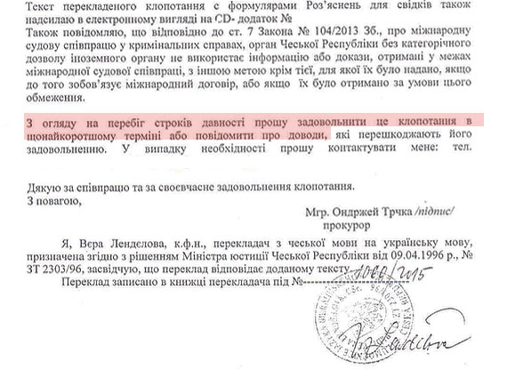Зволікання з цим може дозволити Мартиненку уникнути відповідальності. "З огляду на перебіг строків давності, прошу задовольнити це клопотання в щонайкоротшому терміні", – ідеться в запиті до Шокіна прокурора Ондржея Трчка.