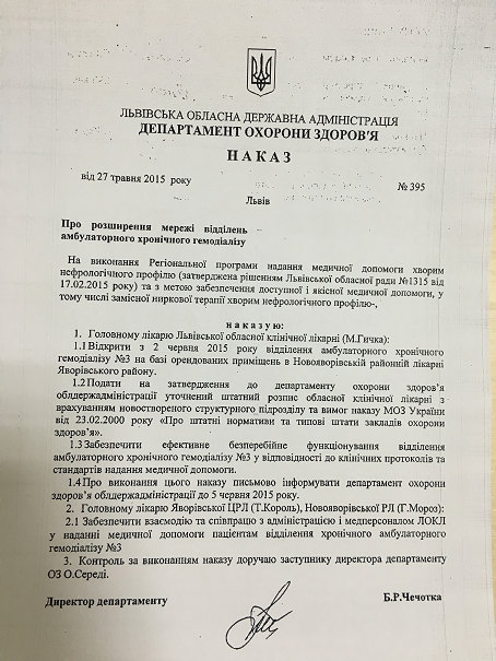 Еще в мае этого года глава Департамента здравоохранения ЛОДА Б.Чечетка подписал приказ, в котором четко обязал М. Гичку обеспечить бесперебойное функционирование нового отделения для гемодиализа.