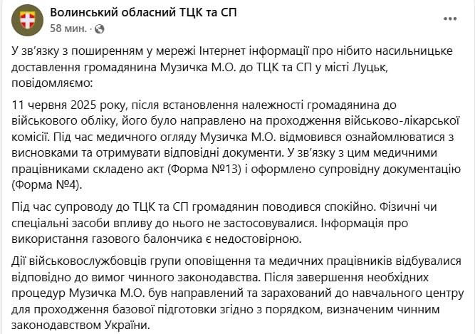 Волынский ТЦК утверждает, что житель Луцка, оказавшийся в критическом состоянии после принудительной мобилизации, успешно прошел медицинскую комиссию и был доставлен в учебный центр без травм.