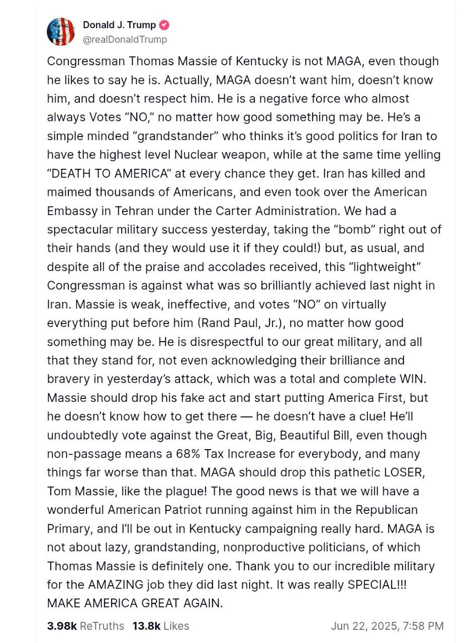 «Мэсси — это слабый, неэффективный политик, который не уважает американские вооруженные силы и не признает их блестящую и смелую работу во вчерашней атаке», — заявил Трамп.
