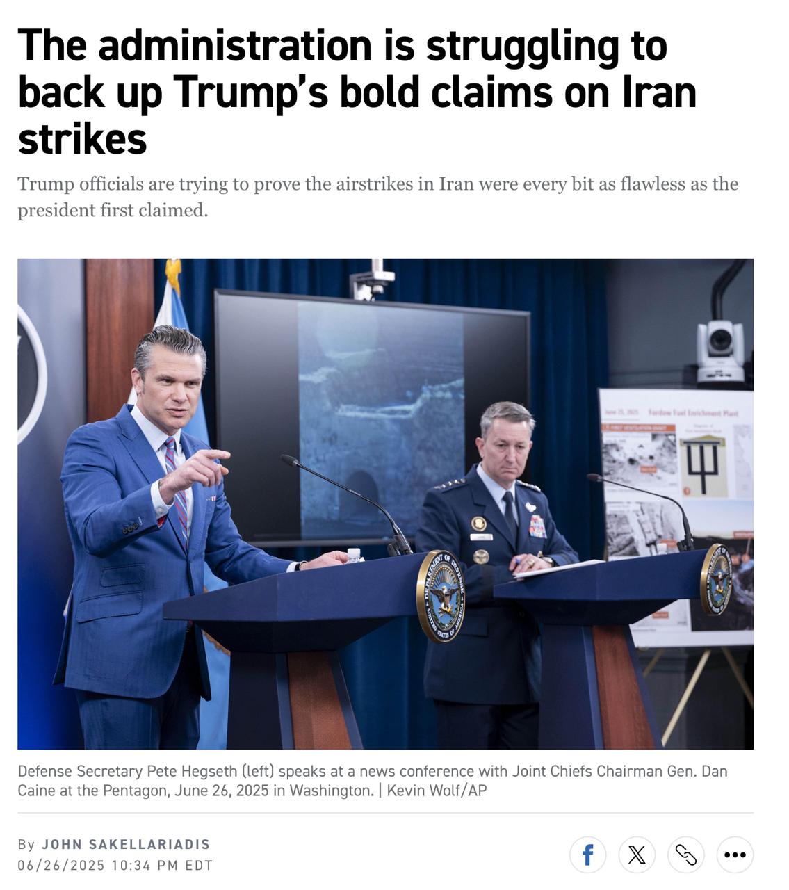 Некоторые официальные лица, видимо, избегали заявлений, что Иран больше не в состоянии создать ядерное оружие, сосредотачиваясь на оценке ущерба, нанесенного трем объектам: Фордо, Натанз и Исфахан.