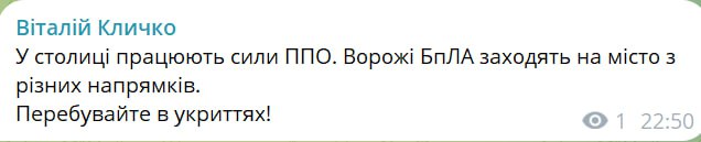 По его словам, в небе над столицей работает противовоздушная оборона. Враг атакует с разных направлений, поэтому жителям города настоятельно рекомендуется оставаться в укрытиях до завершения воздушной тревоги.