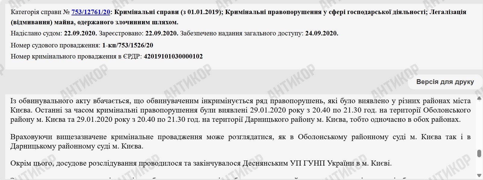 Также авторы поста дают ссылку на Единый государственный реестр судебных дел, из которого следует, что в Деснянском районного суда Киева действительно имеется судебное дело №754/1046/20 по уголовному производству № 42019101030000102 от 16.04.2019 года по статье 303 часть 2 УК «Сутенерство или втягивание в занятие проституцией». Конечно, подозреваемые в данном решении обезличены, поскольку суд продолжается и решения по делу, которое бы набрало законной силы, нет.