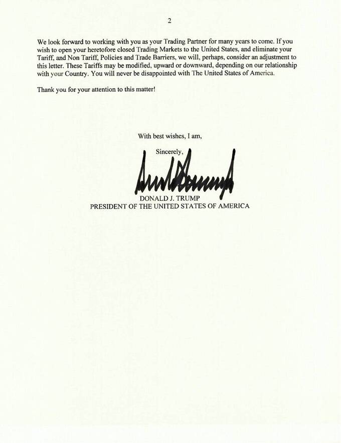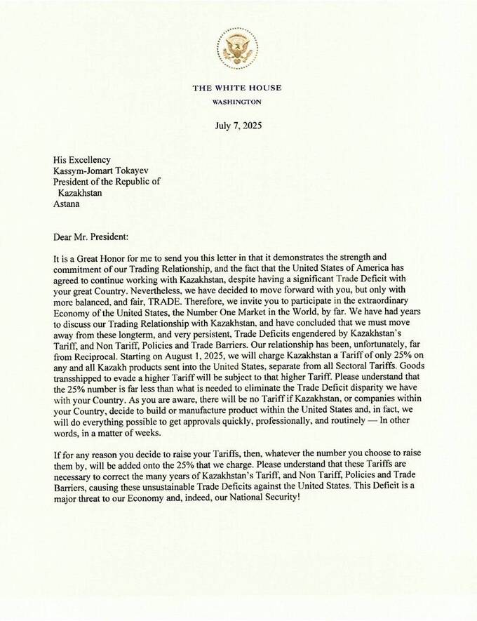 В дополнение к Японии и Южной Корее, Трамп послал письмо президенту Казахстана Токаеву касательно установления 25-процентных пошлин с 1 августа.
