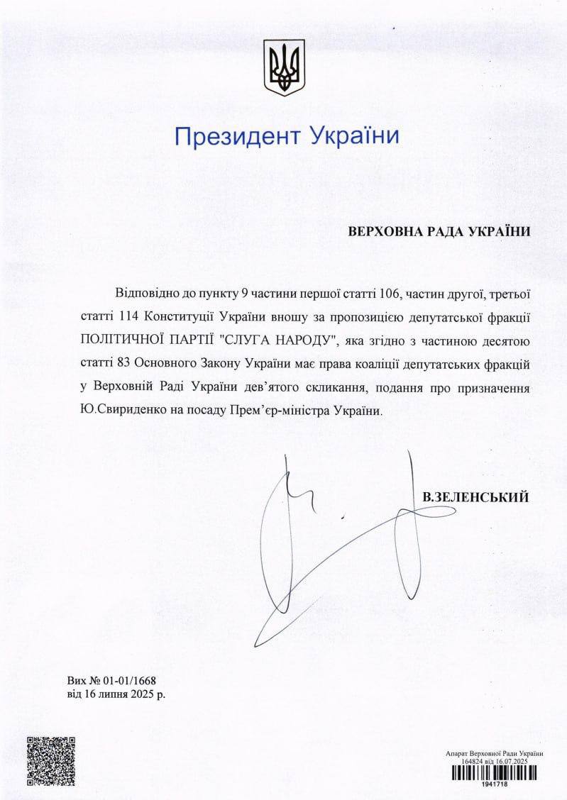 Зеленский внес кандидатуру Юлии Свириденко на должность премьер-министра