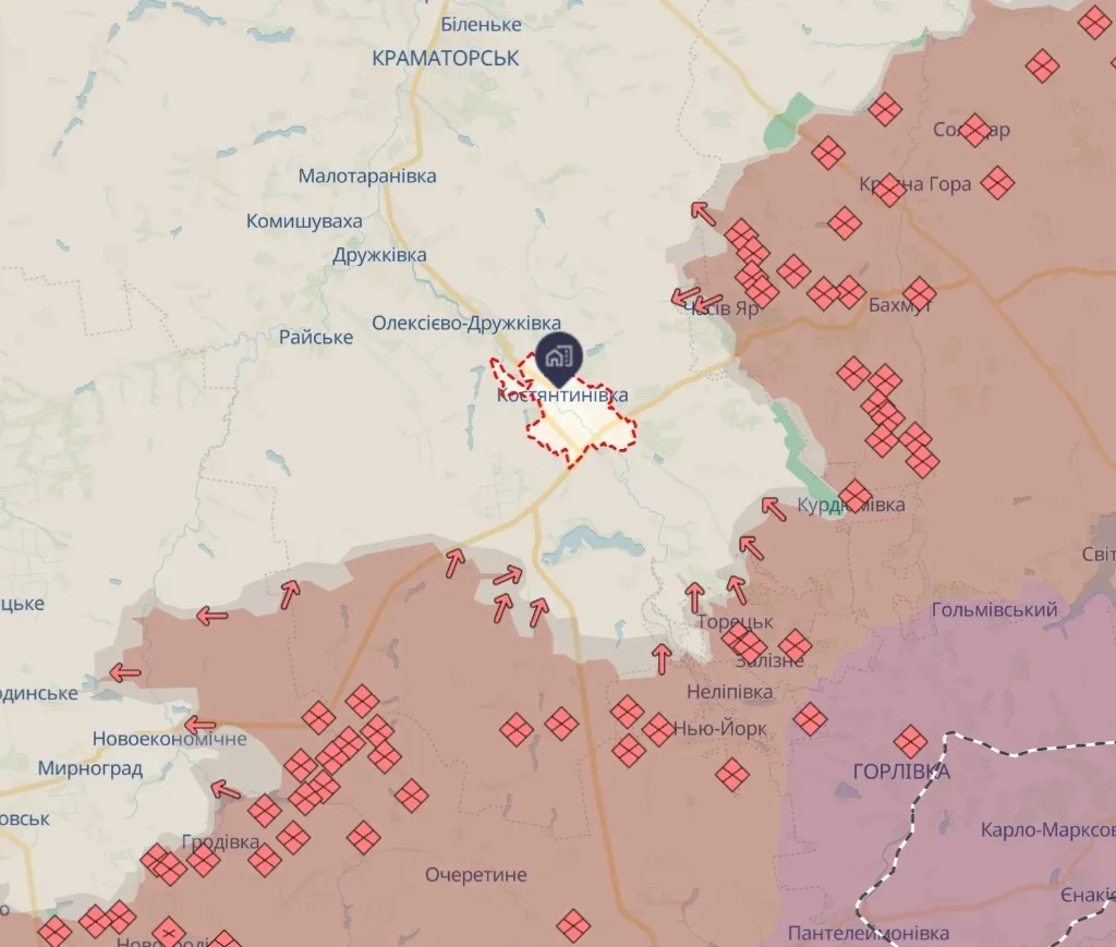 Карта DeepState также показывает продвижение к Константиновке – ещё одному ключевому узлу на востоке – к которому РФ за последние две недели быстро приблизилась с юго-востока и юго-запада и который теперь подвергается регулярным ударам дронов.