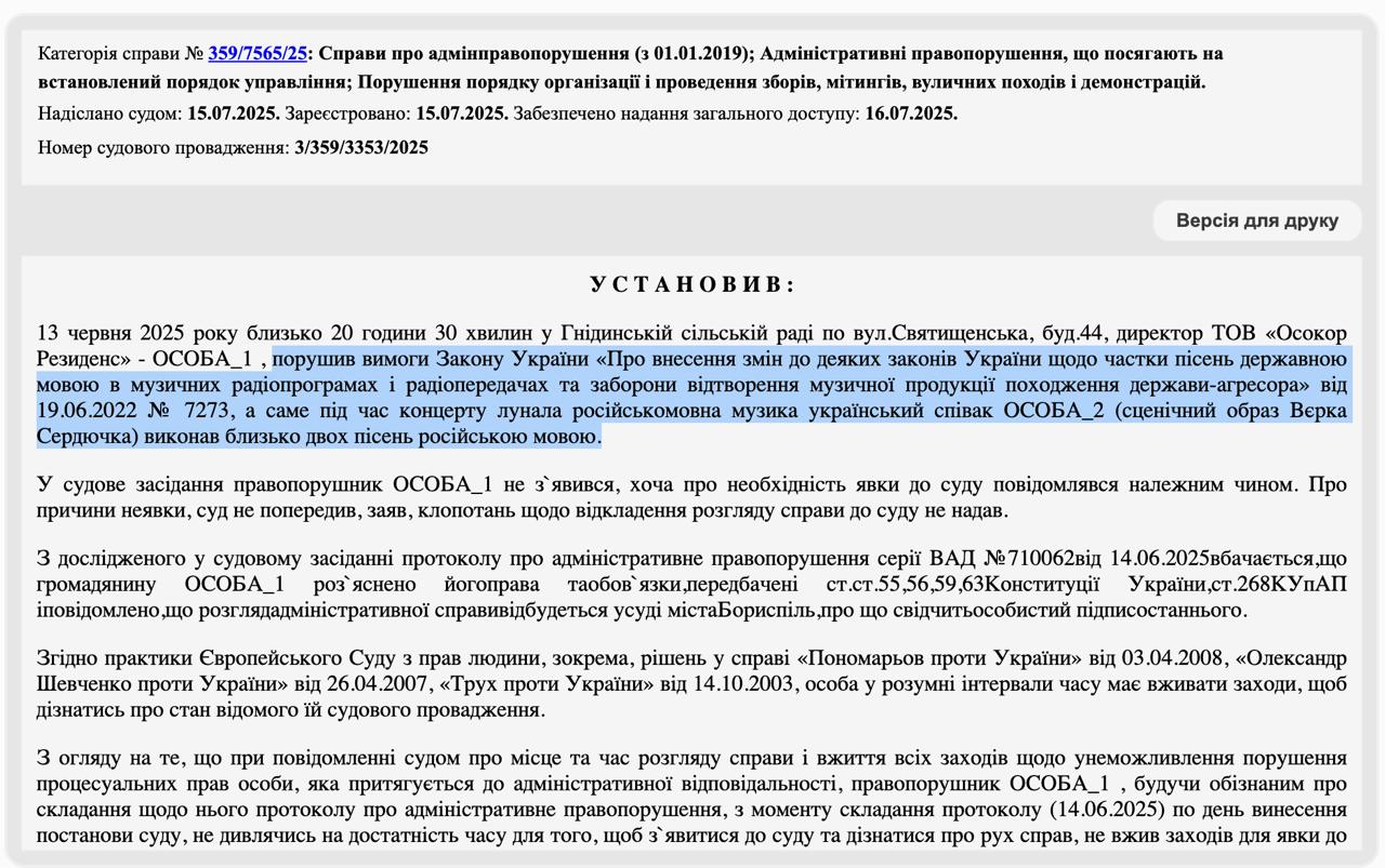 Предпринимателя признали виновным в нарушении языкового законодательства во время концерта 13 июня. Кроме того, он должен уплатить судебный сбор в размере 605 грн.
