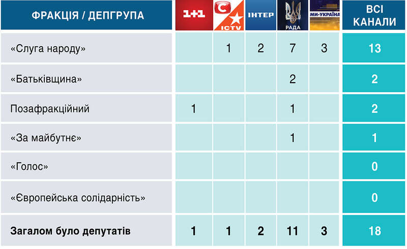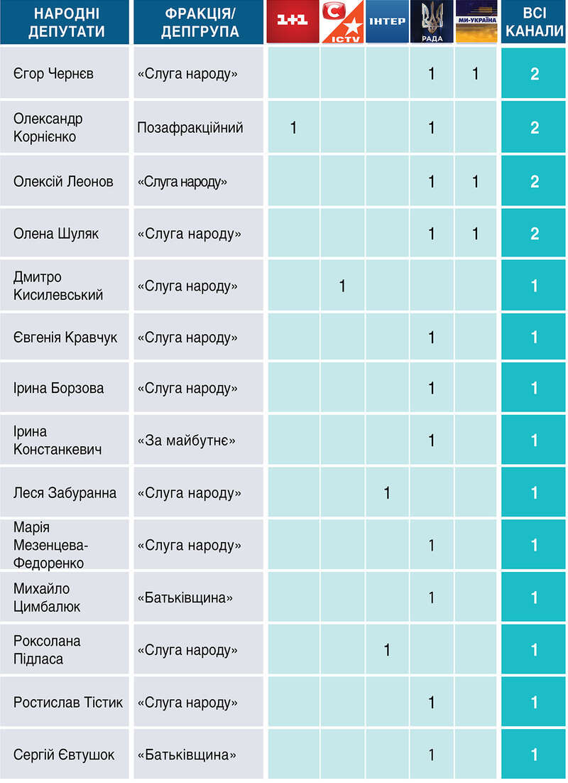 Кроме того, три раза в эфире канала побывала представительница «Голоса» Юлия Сирко, дважды — «слуги народа» Василий Мокан и Богдан Кицак, Нина Южанина из «Европейской солидарности», Соломия Бобровская и Ярослав Юрчишин из «Голоса». Все остальные нардепы гостевали в эфире один раз.