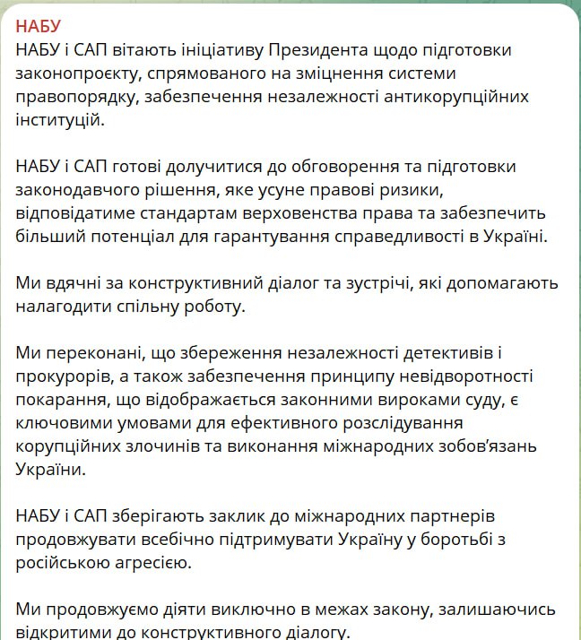 «Мы уверены, что сохранение независимости детективов и прокуроров, а также обеспечение принципа неотвратимости наказания, выражаемого законными приговорами суда, являются ключевыми условиями для успешного расследования коррупционных преступлений и выполнения международных обязательств Украины», – отмечается в заявлении, опубликованном в тг-канале НАБУ.