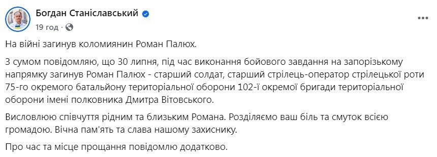 "Выражаю соболезнования родным и близким Романа. Разделяем вашу боль и скорбь всей общиной. Вечная память и слава нашему защитнику", – отметил мэр города.