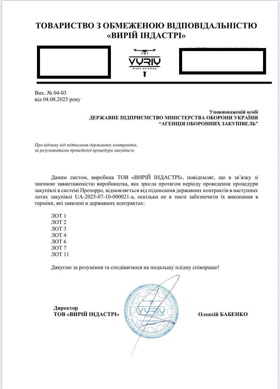 «Vyriy Drone» подала самое низкое ценовое предложение и выиграла 8 из 11 тендерных лотов. Но уже через несколько дней после победы заявила о «чрезмерной загрузке производства» и отказалась выполнять сразу 7 контрактов. Причем торги длились всего один день, и производитель точно знал о своих мощностях.