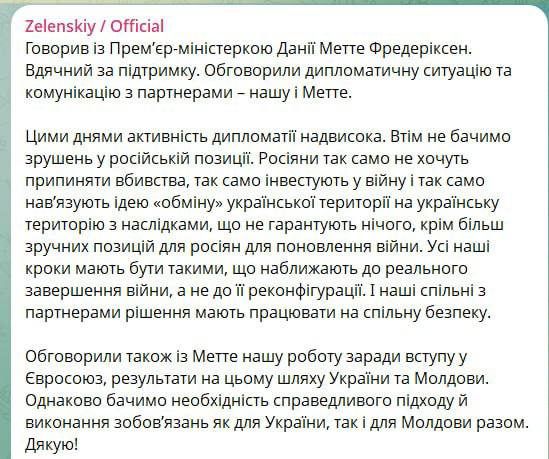 "Мы не видим изменений в российской позиции. Россия и далее отказывается прекращать убийства, продолжает вкладывать средства в войну и настаивает на "обмене" украинской территории на украинскую территорию с результатами, которые не обеспечивают ничего, кроме более выгодных условий для возобновления войны со стороны россиян", - написал президент в своем телеграм-канале по итогам беседы с премьер-министром Дании Фредериксен.