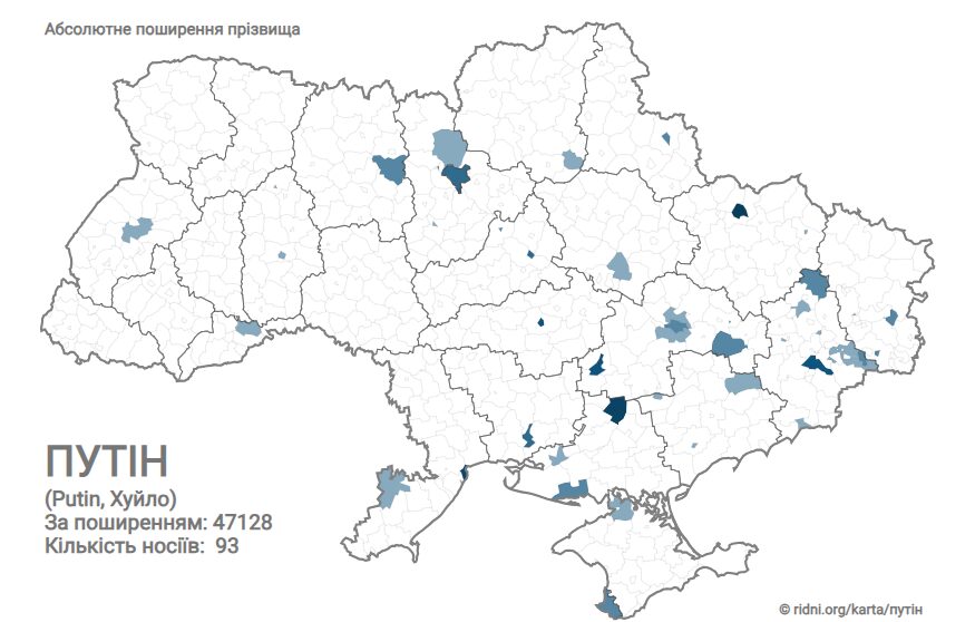 В частности, двое людей с этой фамилией проживают в Днепре, четверо — в Кривом Роге, а еще трое — в других районах области. В целом в Украине насчитывается 93 человека с фамилией Путин. Наиболее распространенные имена среди них — Сергей и Людмила.