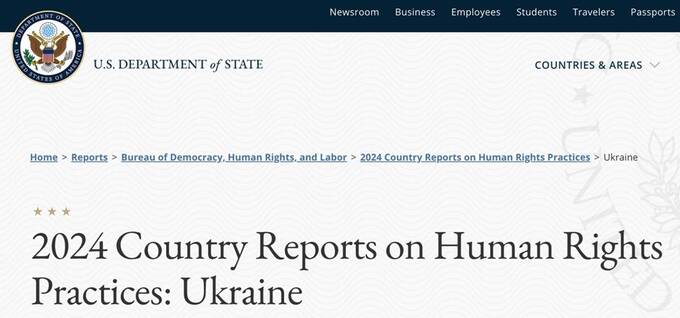 «Управление Верховного комиссара ООН по правам человека продолжало получать сообщения о произвольных задержаниях. Например, в декабрьском отчете УВКПЧ указало на пять случаев, когда украинские власти якобы произвольно задерживали мужчин, которые пытались воспользоваться правом на отказ от военной службы по убеждениям совести. По данным УВКПЧ, власти удерживали мужчин от двух до четырех дней и подвергали их жестокому обращению или пыткам, включая избиения и удушение. Более того, Организация Объединенных Наций продолжает сообщать о случаях произвольного задержания в предыдущие годы. В феврале специальный докладчик ООН по вопросу о пытках и других жестоких, нечеловеческих или уничижительных видах обращения и наказания опубликовал отчет, содержащий интервью с задержанными в Украине в 2023 году. В некоторых случаях задержанные сообщали, что СБУ арестовывала их без ордера, держала в изоляции, избивала и заставляла подписывать документы», — говорится в отчете Госдепартамента.