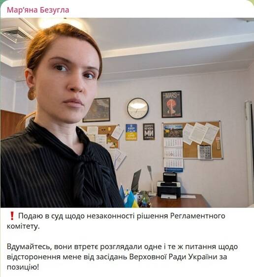 Комитет Верховной Рады по регламенту рекомендовал исключить депутата Марьяну Безуглую из заседаний Рады.