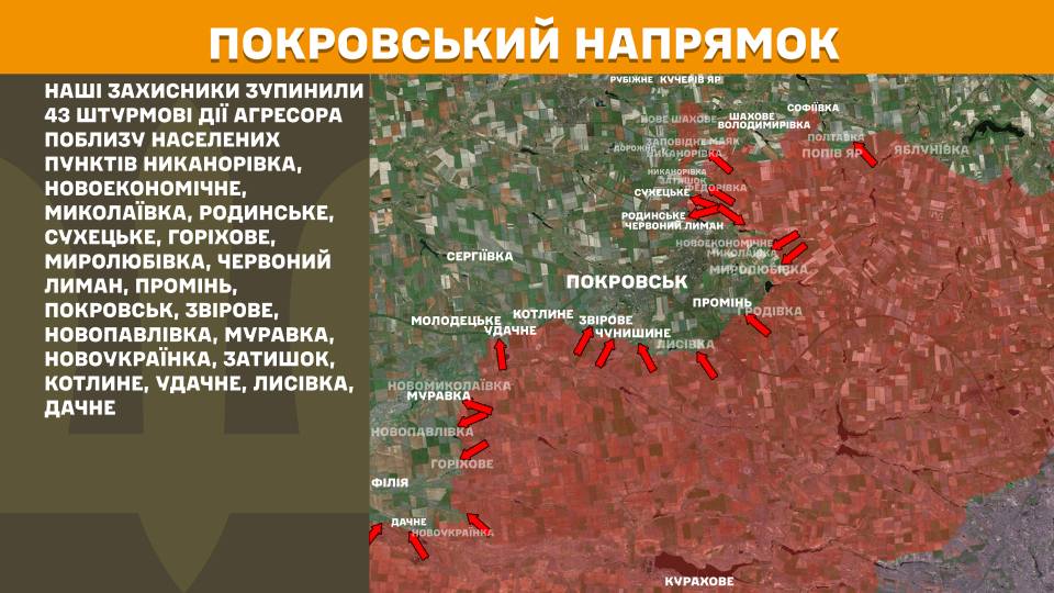 На Покровском направлении в течение прошедших суток украинские защитники остановили 43 штурмовые действия агрессора вблизи населенных пунктов Никаноровка, Новоэкономическое, Николаевка, Родинское, Сухоцкое, Орехово, Миролюбовка, Красный Лиман, Промень, Покровск, Звирово, Новопавловка, Муравка, Новоукраинка, Затишок, Котлино, Удачное, Лысовка, Дачное.