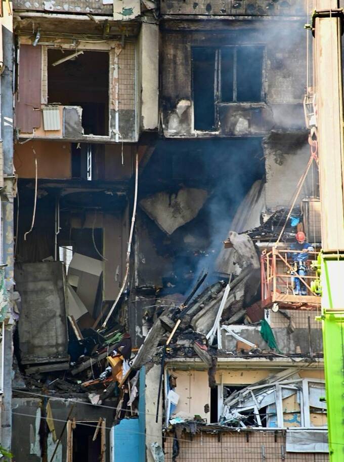 В Святошинском районе Киева во время ночного обстрела частично рухнул подъезд девятиэтажного дома.