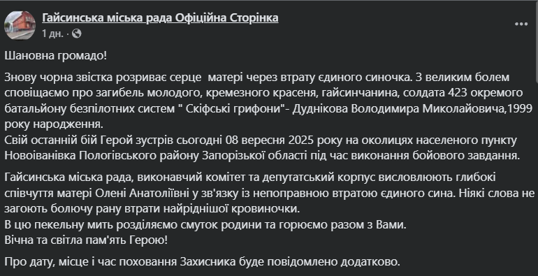 "Снова черная весть разрывает сердце матери из-за потери единственного сыночка. С большой болью сообщаем о гибели молодого, крепкого красавца, гайсинчанина, солдата 423 отдельного батальона беспилотных систем "Скифские грифоны" Дудникова Владимира Николаевича, 1999 года рождения", – говорится в сообщении.