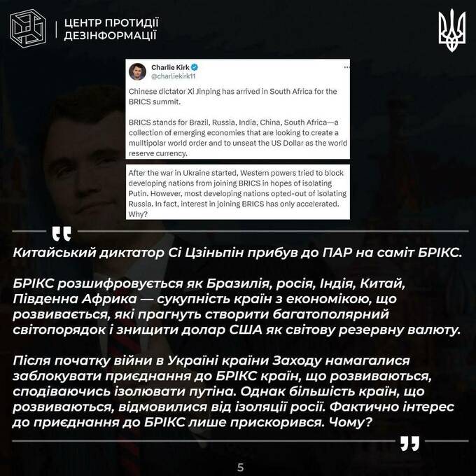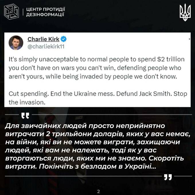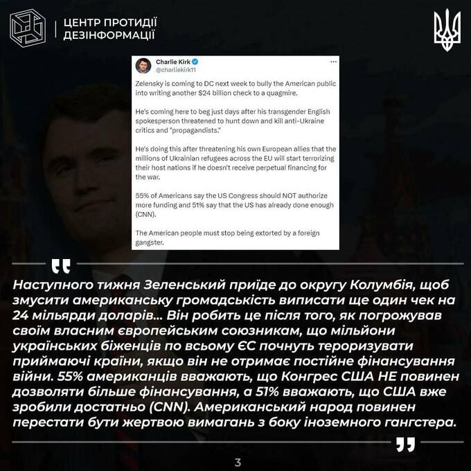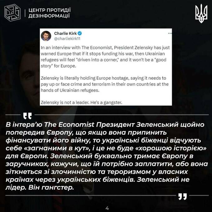 Заявлялось, что он продвигает на Западе «тезисы российской пропаганды». Примеры этих тезисов также приводит ЦПД (см. скриншоты). В них, среди прочего, Зеленского критикуют за то, что он "получает чеки" от администрации Байдена.